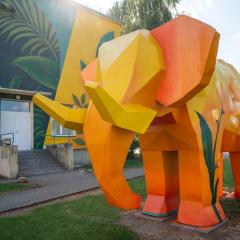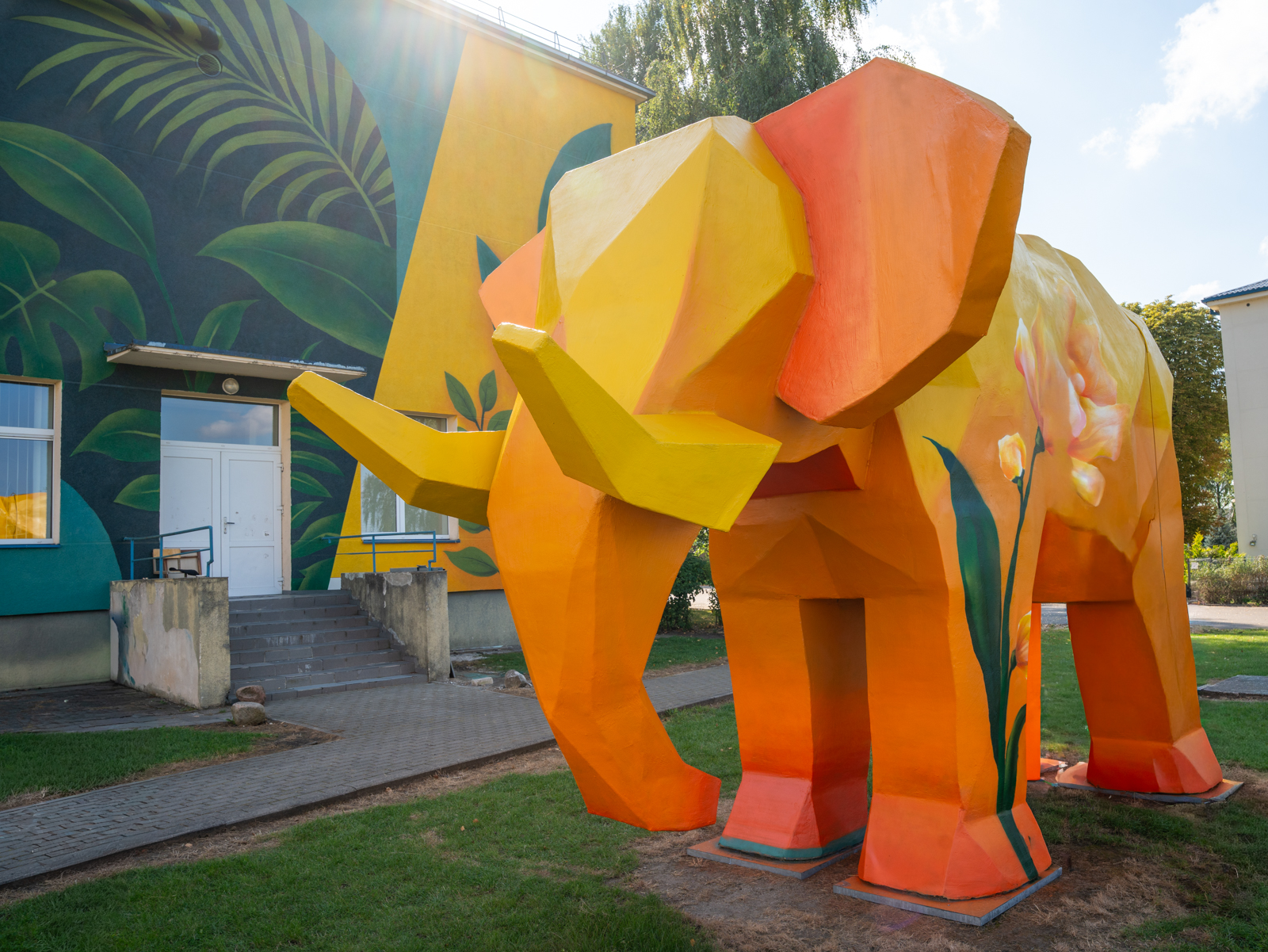 Ryškiai geltonas, gėlėmis apsuptas ir egzotiškų džiunglių fone stovintis dramblys, vardu Mango, nuo praėjusių metų džiugina Alytaus Piliakalnio gimnazijos bendruomenę ir čia užsukančius lankytojus.