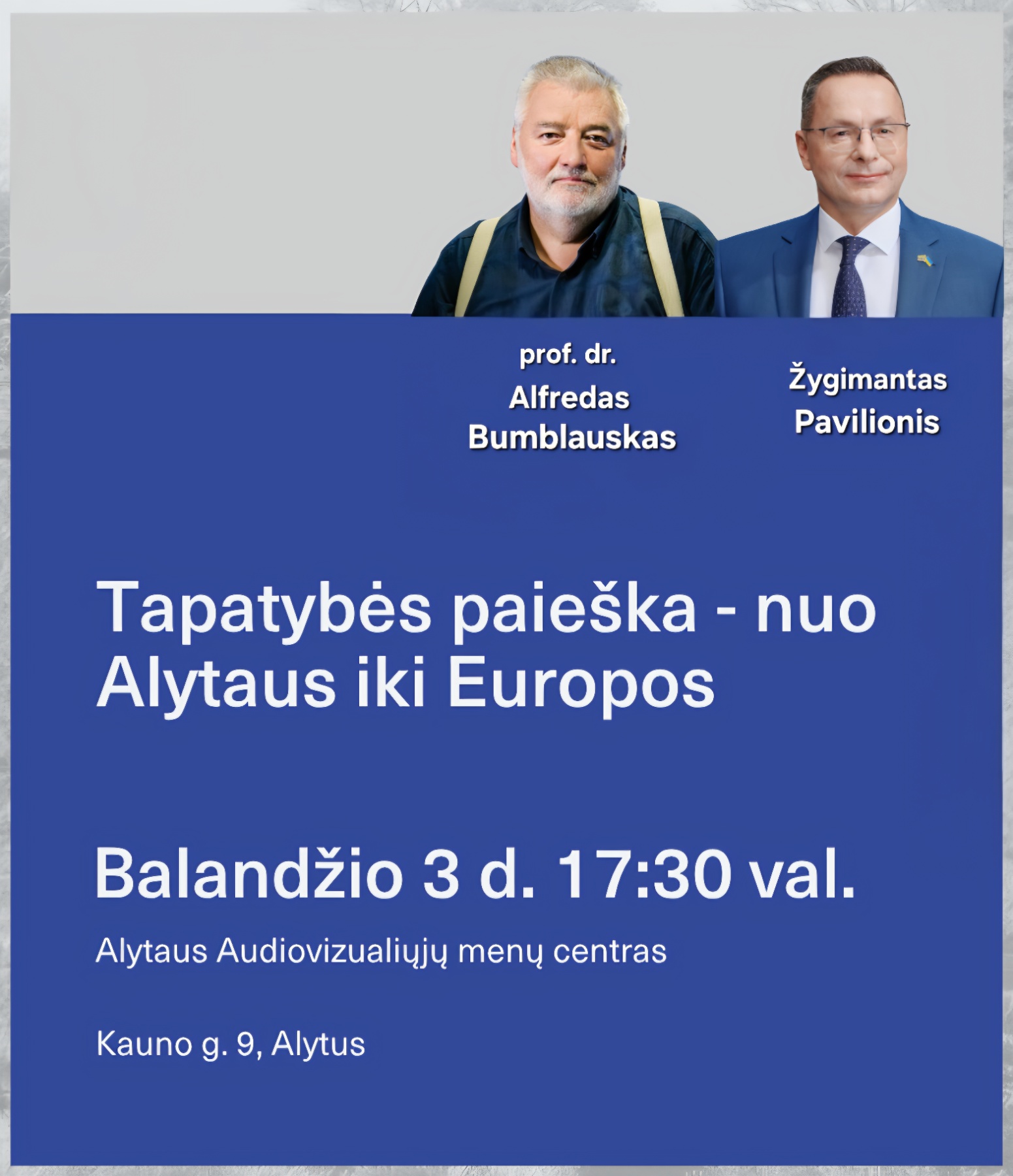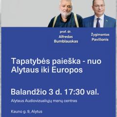 17.30 val. Atvira diskusija „Tapatybės paieška – nuo Alytaus iki Europos“ Audiovizualiųjų menų centre (AMC, buv. sinagogoje, Kauno g.). Dalyvaus: istorikas prof. dr. Alfredas Bumblauskas, moderuos jo buvęs studentas, parlamentaras Žygimantas Pavilionis.