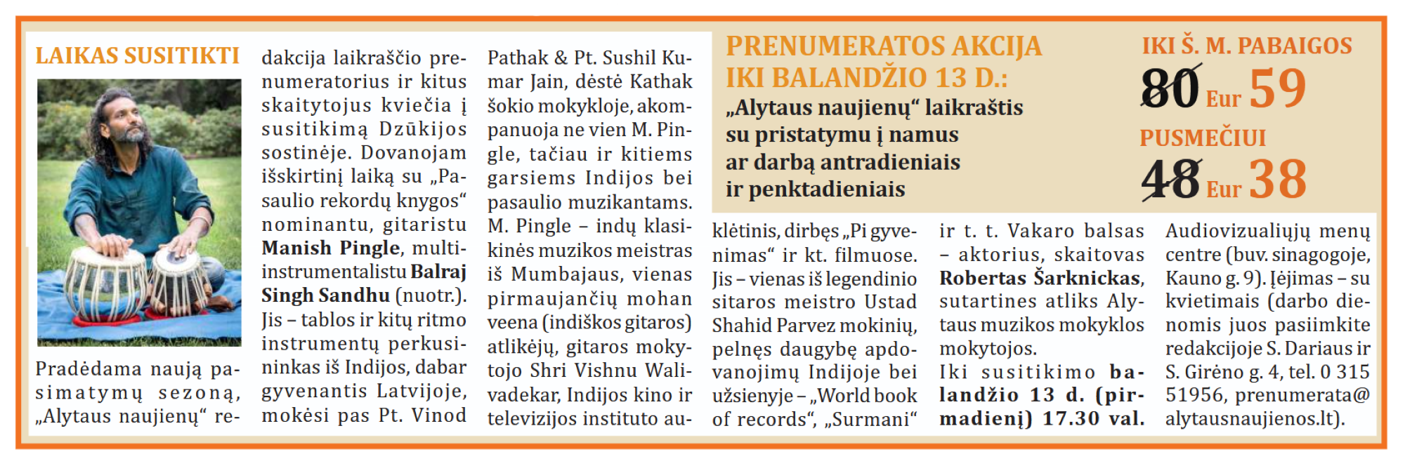 17.30 val. „Alytaus naujienų“ skaitytojų susitikimas – nemokamas senovinės indiškos ir lietuviškos muzikos (sutartinių) koncertas bei skaitovo Roberto Šarknicko eilės AMC (buv. sinagoga, Kauno g.). Su kvietimais.