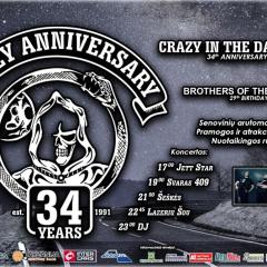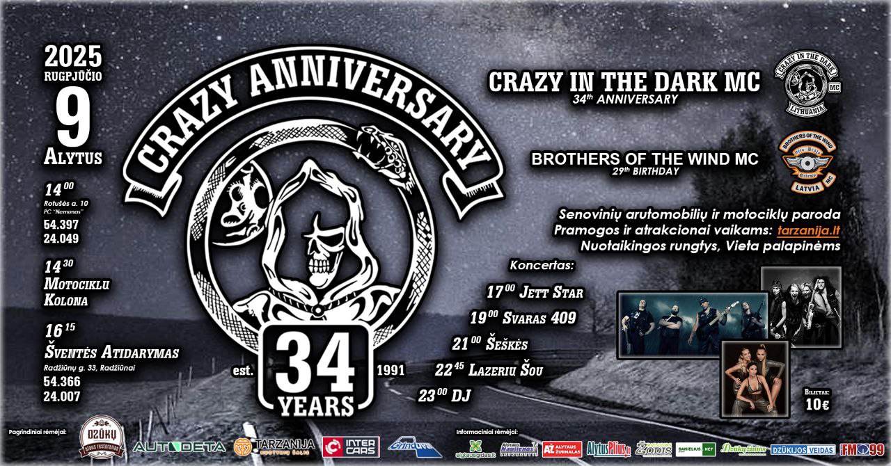 Nuo 16.15 val. Baikerių klubo „Crazy in the dark“ gimtadienio šventė „Tarzanijoje“ (Radžiūnų k., Alytaus r.) su grupėmis „Jett star“, „Svaras 409“, „Šeškės“, lazerių šou, diskoteka ir kt. Su bilietais.