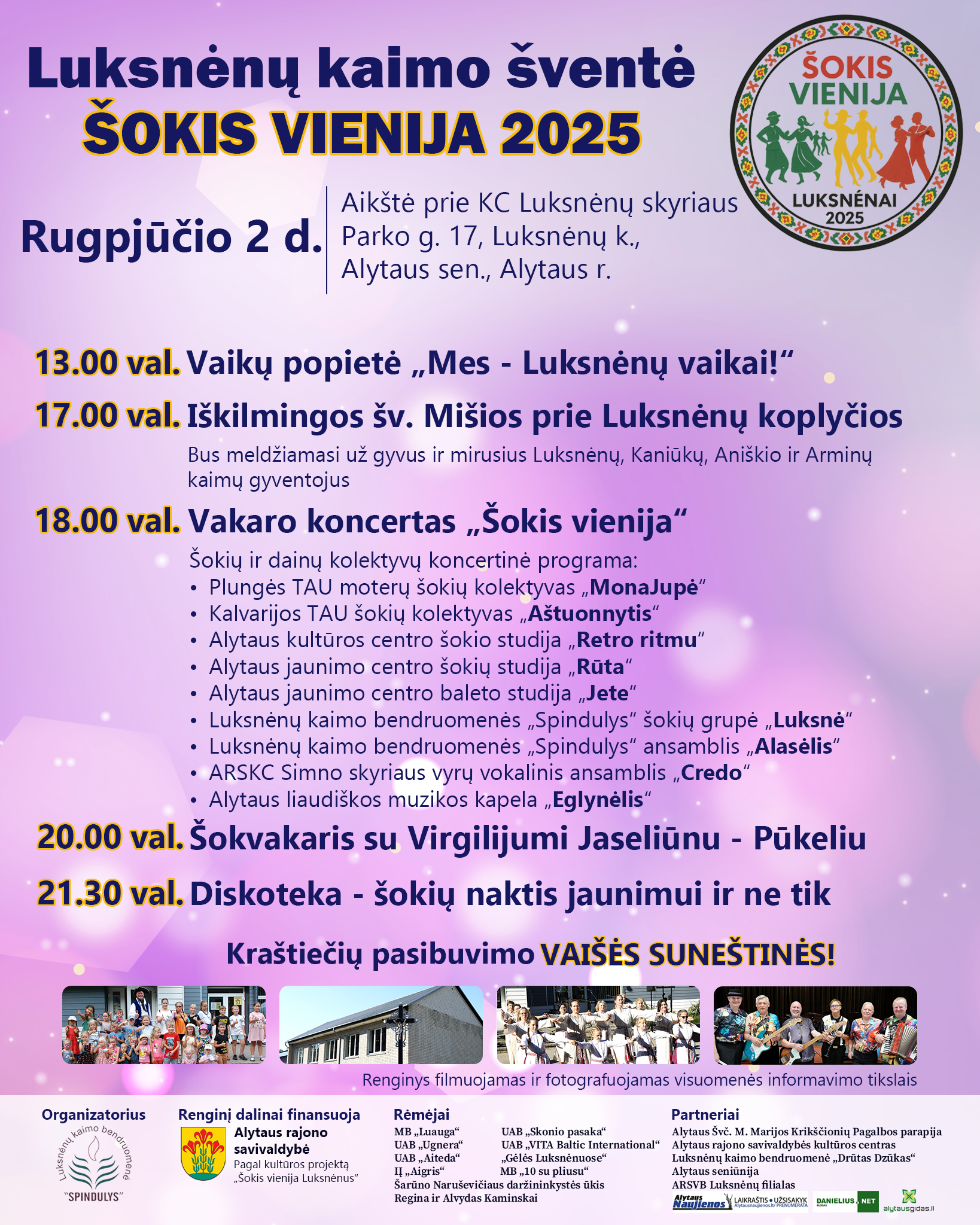 18 val. Luksnėnų kaimo šventė „Šokis vienija“. Programoje: Luksnėnų „Luksnė“ ir kiti šokių kolektyvai iš Dzūkijos, Suvalkijos, Žemaitijos, ansambliai „Alasėlis“, „Credo“, kapela „Eglynėlis“, Virgilijus Jaseliūnas (Pūkelis). Po koncerto – diskoteka jaunimui ir ne tik.