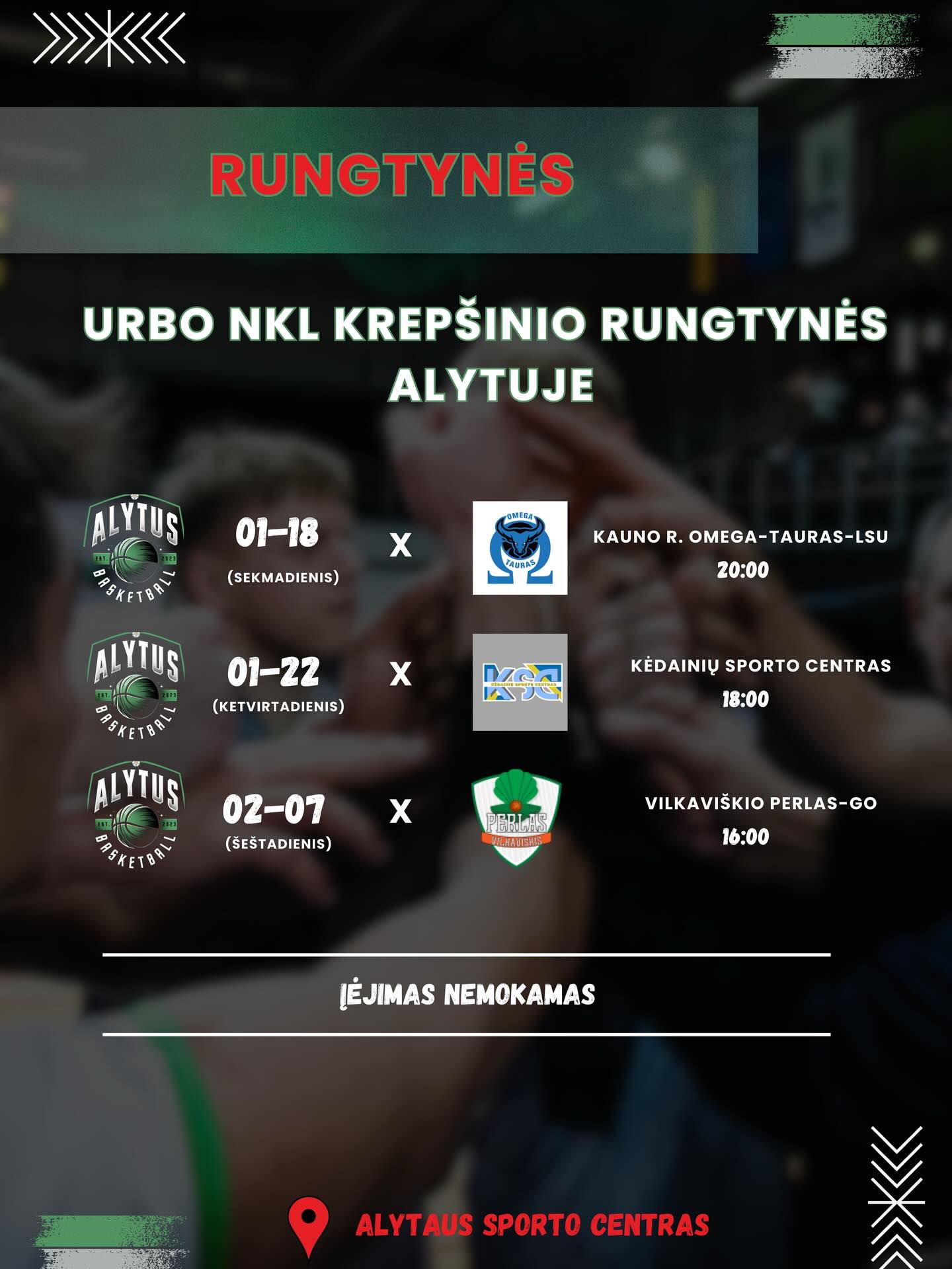 18 val. NKL rungtynės ASC arenoje (Naujoji g.). Susitinka: „Alytus“ ir Kėdainių SC.